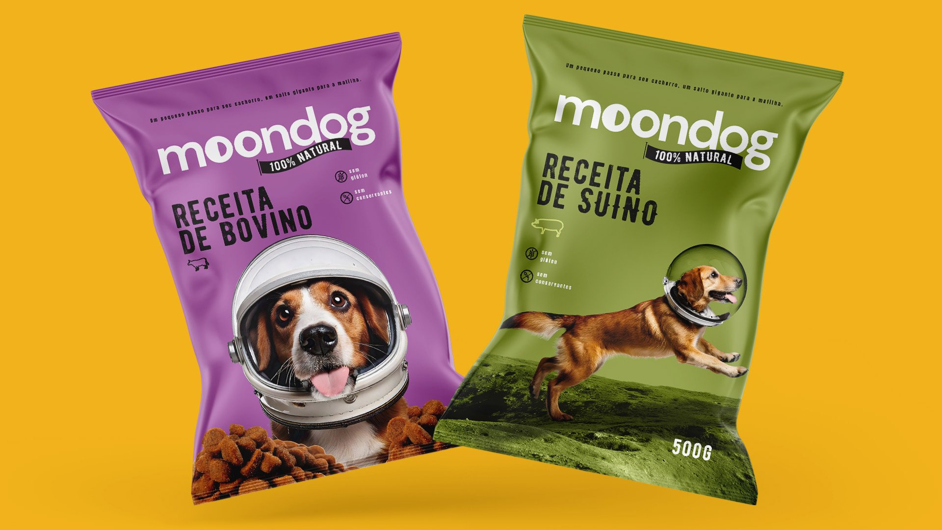 Moondog é uma marca de ração natural que nasceu com uma história única e divertida. O nome, criado por mim, tem uma conexão com o storytelling em que um cão vai para a lua e descobre a melhor ração do mundo, trazendo de volta à Terra o segredo de uma alimentação saudável e saborosa. A marca brinca com a ideia de “ter a cabeça na lua”, sugerindo que, assim como o cão da história, nossos pets merecem a melhor alimentação, que os faça pensar em algo tão extraordinário quanto a ração Moondog. Para dar vida a essa proposta, desenvolvi toda a identidade visual, incluindo o nome, logo, embalagens e um trabalho completo de marca, trazendo um conceito criativo e envolvente para o mercado de pet food.